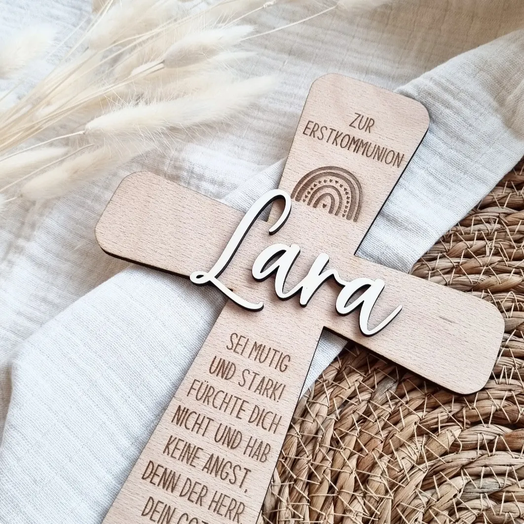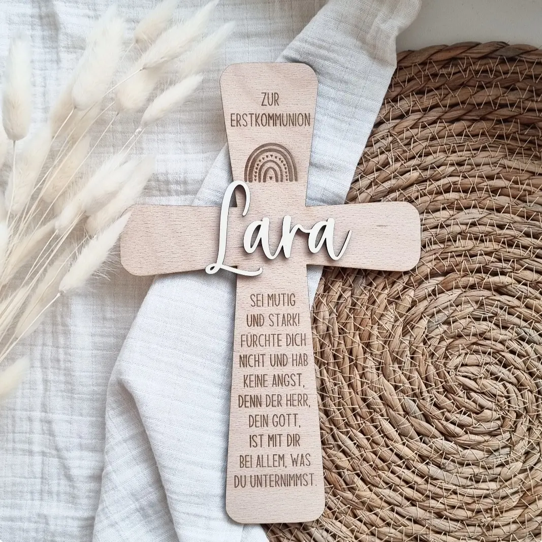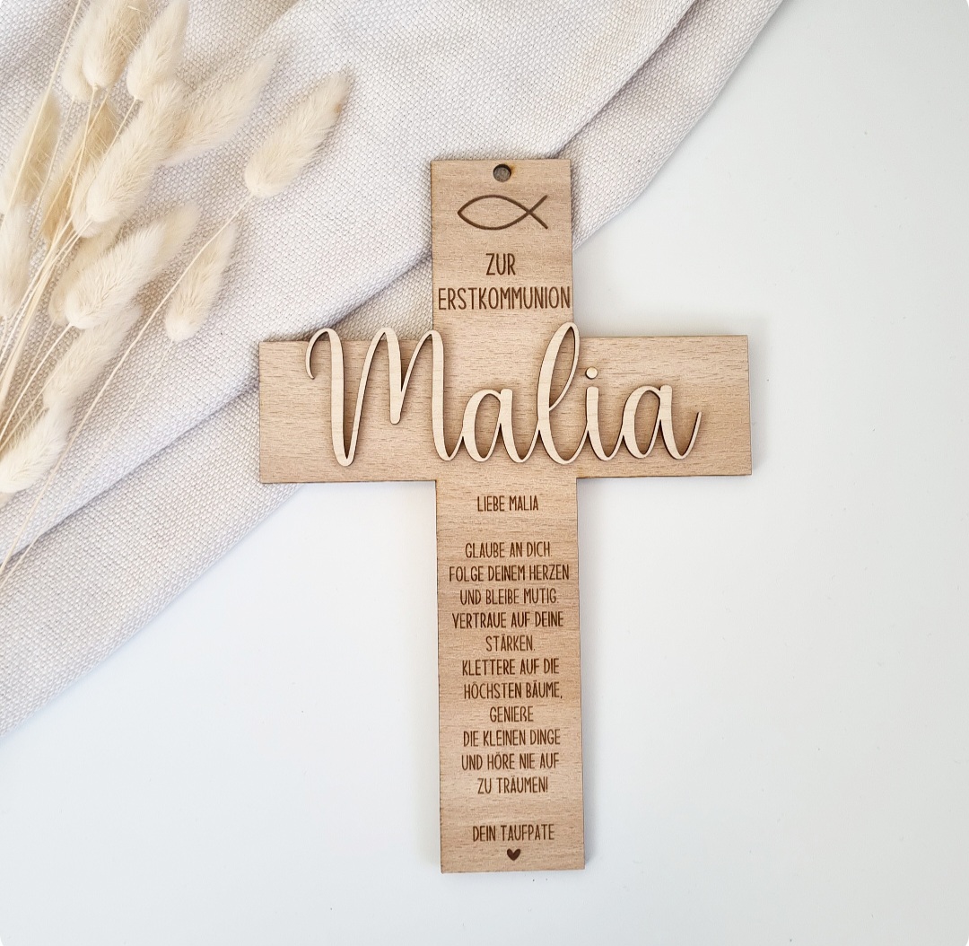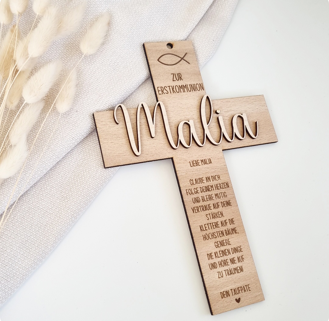 Egal ob zur Taufe, Erstkommunion oder als Geschenk zur Geburt, dieses personalisierte Kreuz sieht wunderschön aus. Variante 1 ist das Kreuz mit den Rundungen. Variante 2 ist die geradlinige Form. Bitte gib im Wunschtextfeld ein, welche Variante du haben möchtest. Motive und Texte sind individuell wählbar.