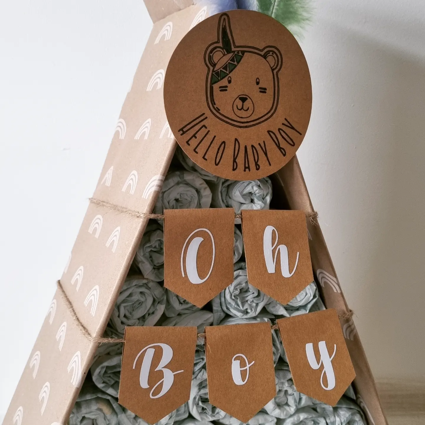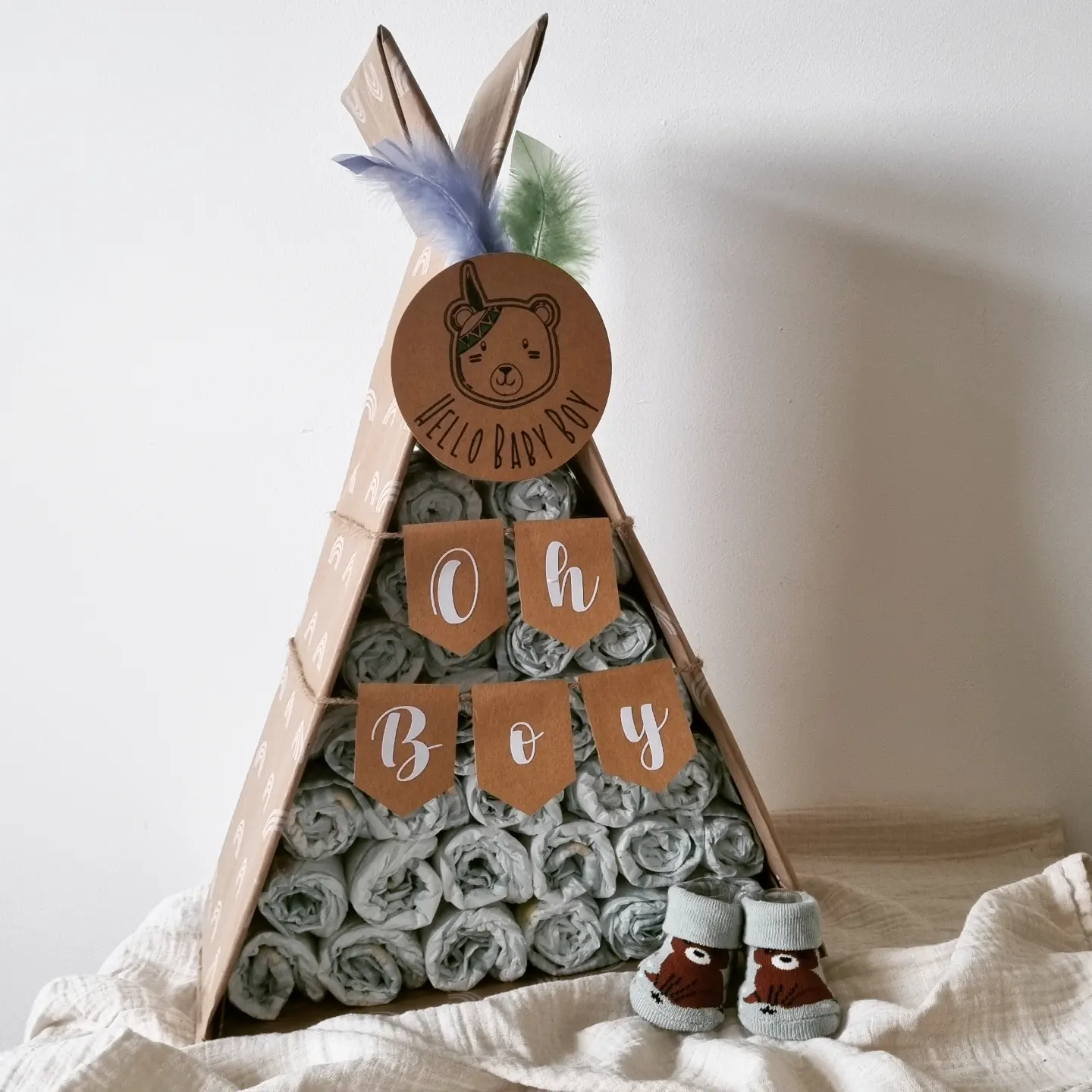 Eine andere Variante zur klassischen Windeltorte. Das Windeltipi kann individuell für ein Mädchen, einen Jungen oder neutral gestaltet werden. Eine Windelpackung der Größe 2 ist inkludiert. Die Wände des Tipis sind aus Karton und werden mit Geschenkpapier verkleidet.
